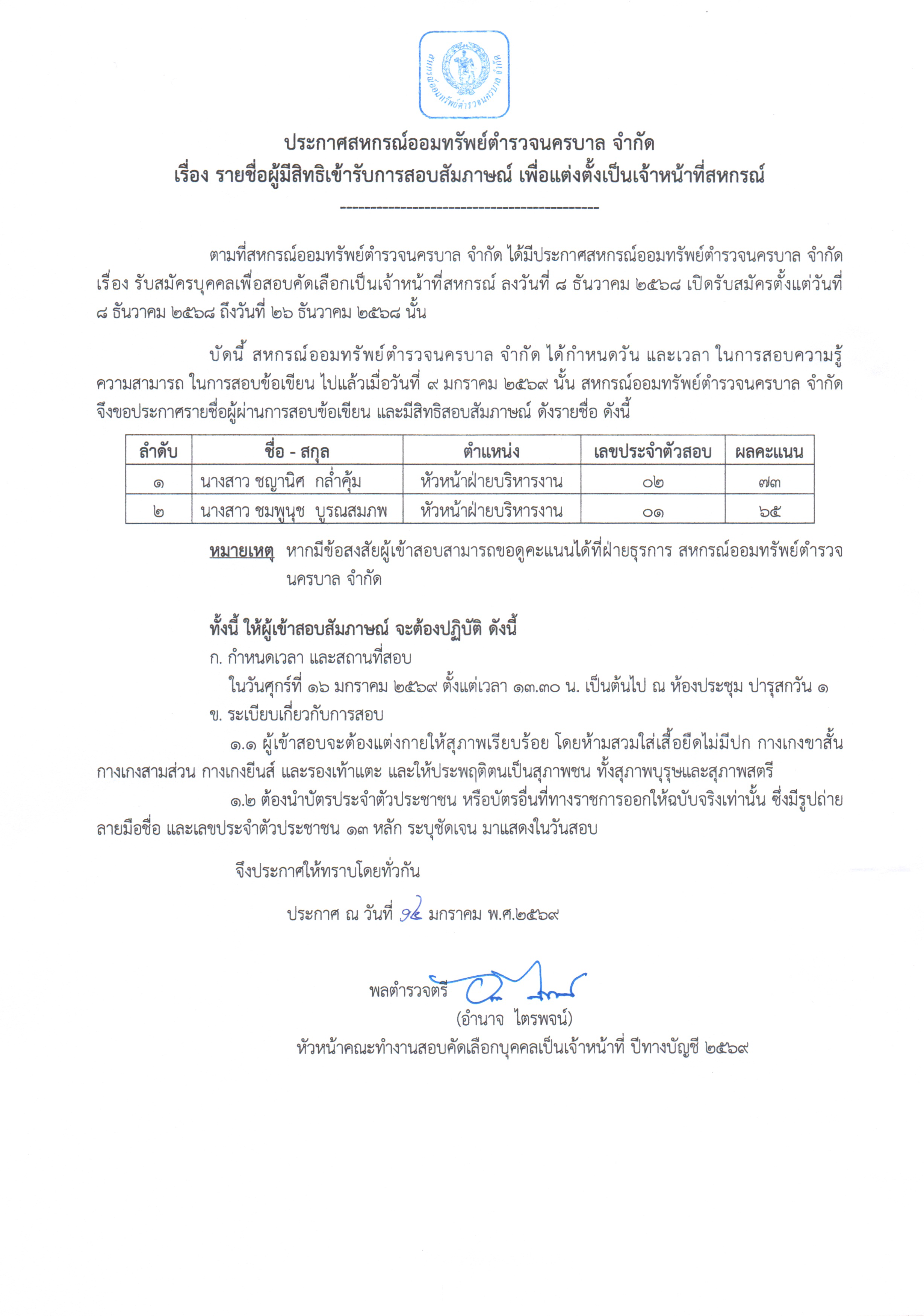 • ประกาศสหกรณ์ เรื่อง รายชื่อผู้มีสิทธิเข้ารับการสอบสัมภาษณ์ เพื่อแต่งตั้งเป็นเจ้าหน้าที่สหกรณ์