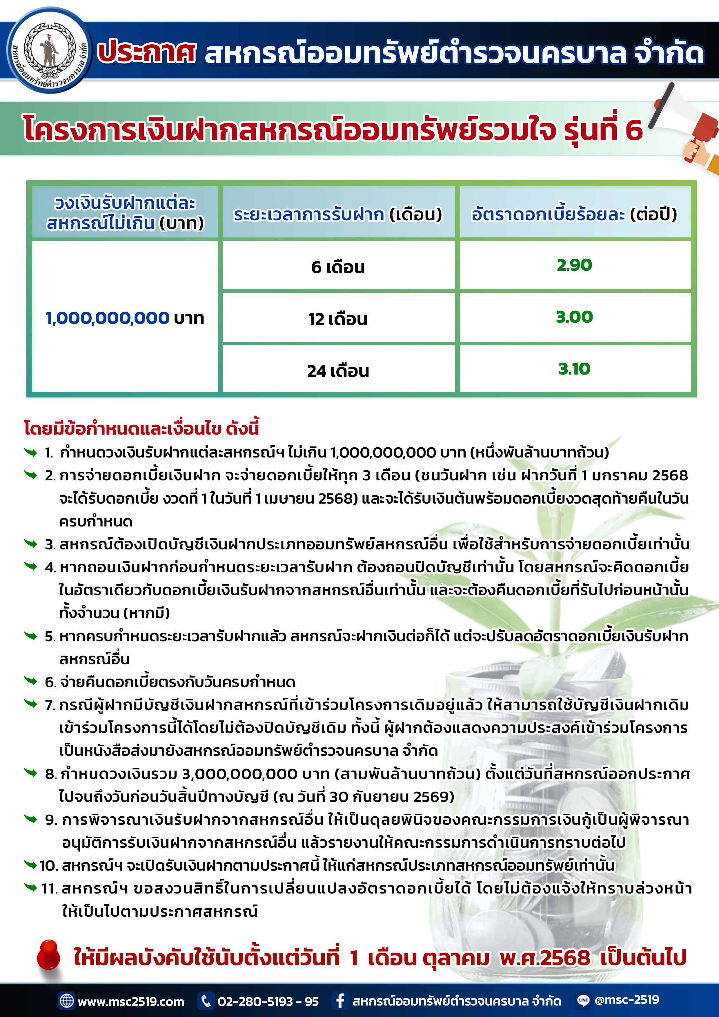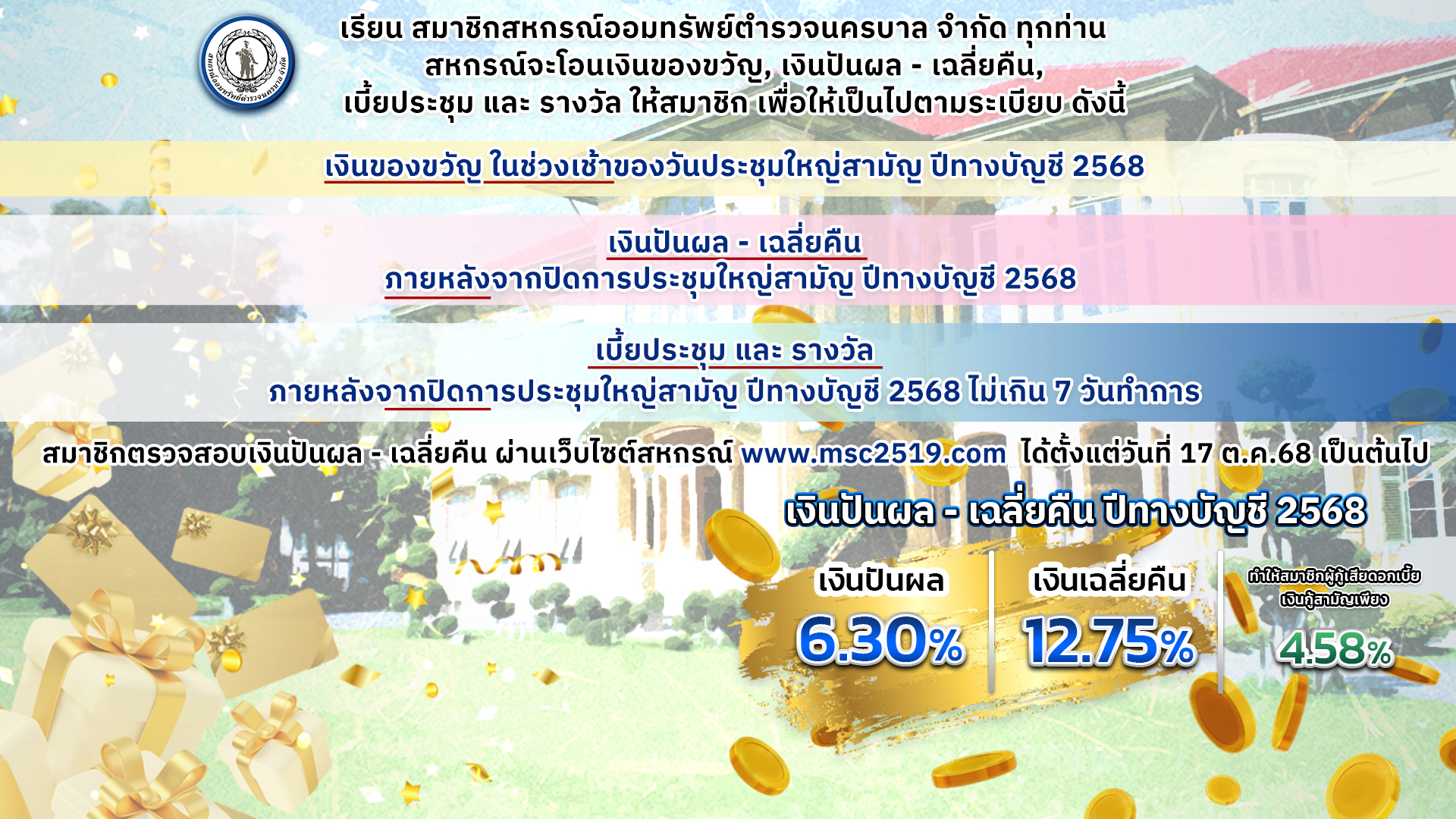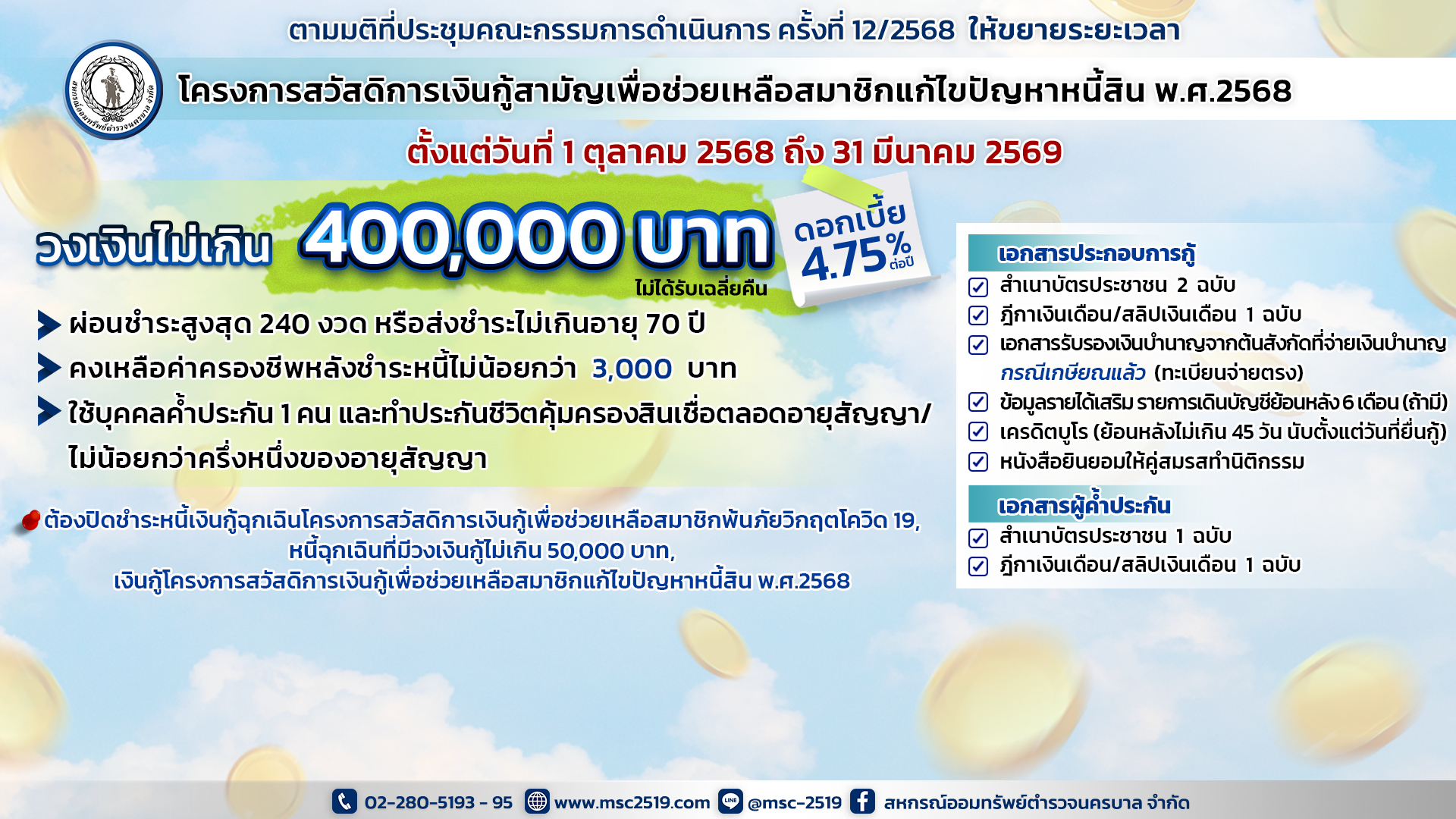 • ขยายระยะเวลาโครงการสวัสดิการเงินกู้สามัญเพื่อช่วยเหลือสมาชิกแก้ไขปัญหาหนี้สิน พ.ศ.2568